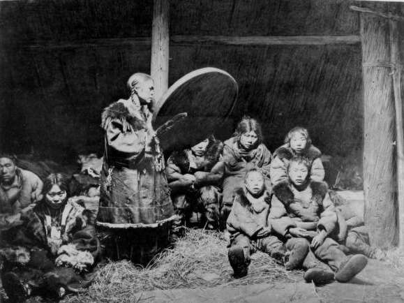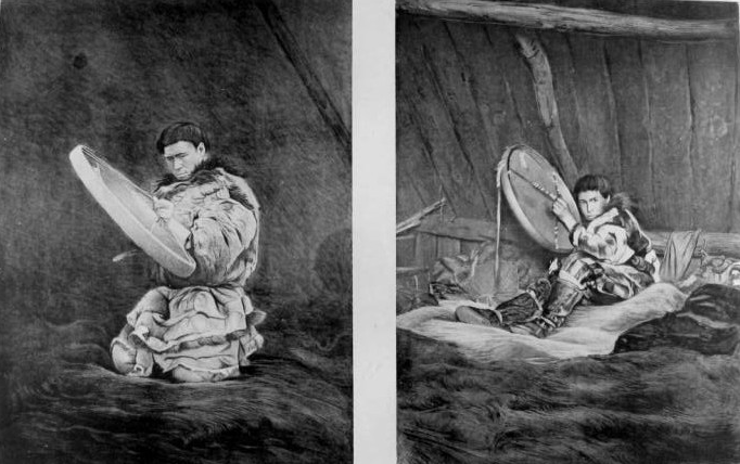 Suddenly he commenced to beat the drum softly and to sing in a plaintive voice: then the beating of the drum grew stronger and stronger; and his song - in which could be heard sounds imitating the howling of the wolf, the groaning of the cargoose, and the voices of other animals, his guardian spirits — appeared to come, sometimes from the corner nearest to my seat, then from the opposite end, then again from the middle of the house, and then it seemed to proceed from the ceiling. He was a ventriloquist. Shamans versed in this art are believed to possess particular power. His drum'also seemed to sound, now over my head, now at my feet, now behind, now in front of me. I could see nothing; but it seemed to me that the shaman was moving around us, noiselessly stepping upon the platform with his fur shoes, then retiring to some distance, then coming nearer, lightly jumping, and then squatting down on his heels.