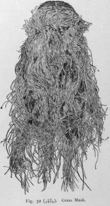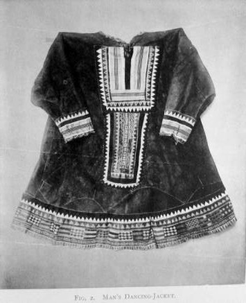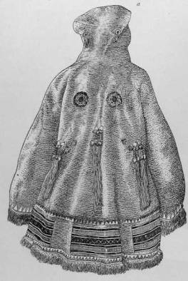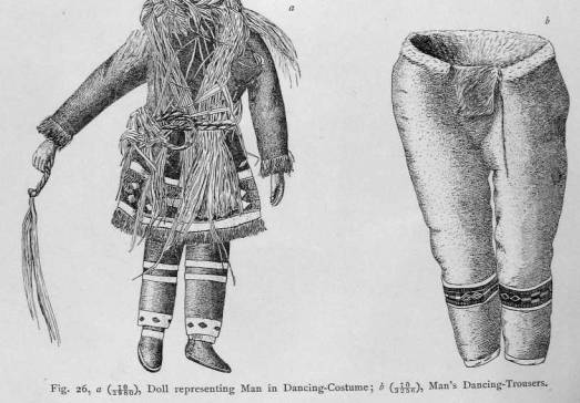 A man's embroidered dancing-coat is represented on Plate I, Fig. 2 (opp. p.48). Other parts of dancing-costumes are shown in Figs. 26 and 27. Fig. 26, a shows a doll made by the Koryak Lalu' from the village of Kamenskoye, and represents an old man dressed in a dancing-costume, and tied around with sacrificial grass; while Fig. 28, a reproduction of a drawing by the old Koryak Yulta of the village Kamenskoye, represents a scene after the capture