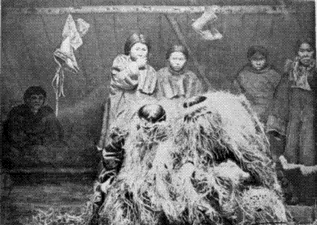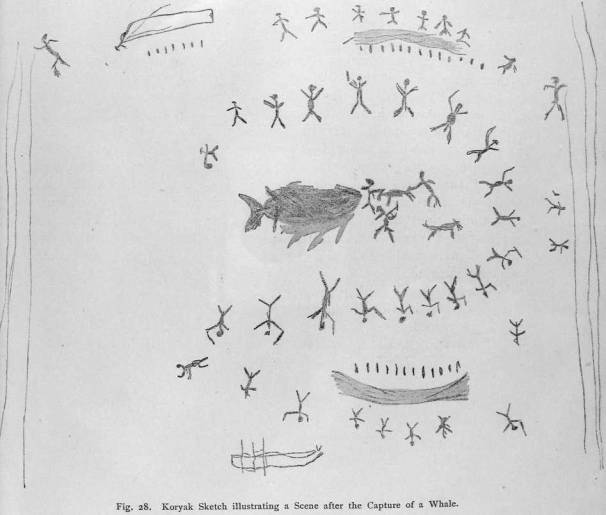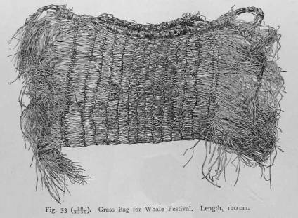 that the summer and fall hunting seasons were over, and was intended to influence the deity so that the hunt of the following year would also prove successful, and that the winter would pass without sickness, or visitation of the kalau. This is Steller's interpretation of this festival, to which he devotes only a few lines. Krasheninnikoff also describes how a grass whale filled with blubber and other kinds of provisions is made. It was tied to the back of one of the women, and at a certain moment those who participated in the celebration threw themselves upon it, tore it up, and ate it, apparently in imitation of a successful hunt.