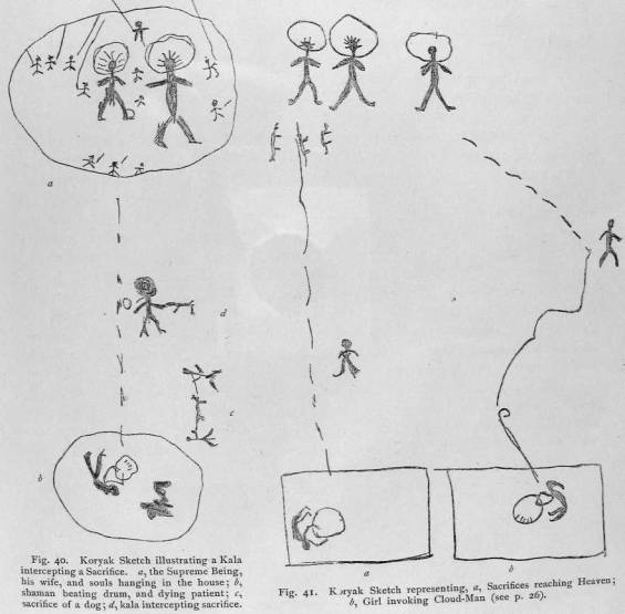 The Reindeer Koryak make dog-offerings mainly to the kalau; and the stabbed dogs are placed on the ground with muzzle pointing westward, or in the direction in which the people are going to travel, that the evil spirits may cause them no harm.