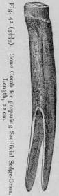 Sacrificial sedge-grass is in use only among the Maritime Koryak. They comb it with a bidentate bone comb (see Fig. 42), which renders it as soft as flax, and make wreaths and necklaces out of it. According to Kraheninnikoff, the Kamchadal used sacrificial grass for the same purpose
