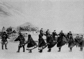 A very common game, or rather physical exercise, is that of running around a circle. In the villages of the Maritime as well as in the camps of the Reindeer Koryak, when the day's work is done, and before supper is served, youths may be seen running around in a circle, while the old people sit on the snow not far away from the players. From the running, a firm circle is trodden down in the snow. The evening games are discontinued with the approach of spring, when frosts no longer occur.