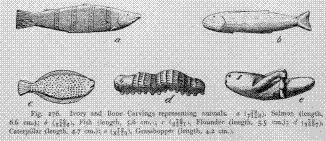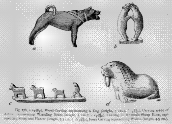 The carvings of the western neighbors of the Koryak, the Tungus and the Yakut, can in no wise be compared with their own. The former lack all artistic merit. Taking as a fair sample the collection of Yakut carvings obtained by me, consisting of figures of animals or human beings made from mammoth-tusks, we find it to consist of rigid figures having only an outward resemblance to men and animals. The artist was unable to put life and motion into them. It is seldom that any of the Yakut can carve even such crude figures. Near Yakutsk, for instance, two or three Yakut are known to turn out open-work from mammoth-ivory. They also turn out rigid realistic carvings of the kind I am describing. They make combs and boxes from mammoth-ivory, ornamented with open-work carving. Yet these articles are rather products of mechanical art, made to meet the demand of the Russians, than works of art for art's sake.
