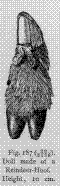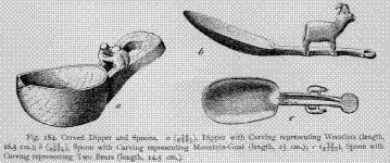 Miniature toy figures of human beings, birds, and other animals, or spoons ornamented with different figures, are frequently made from reindeer-antler and sheep-horn. It is worth noting, that, according to Hoffman, quite a number of specimens of Eskimo workmanship, upon which both simple forms of ornamentation and pictographic records occur, consist of pieces of reindeer- antler shaped into the desired form, and obtained from the barren-ground or woodland caribou; but no specimens of horn of the mountain-sheep or moun- tain-goat, which are employed by the more southern Coast tribes, have as yet been found in the Eskimo collections of either the United States National Museum or the Alaska Commercial Company in San Francisco, Cal.1 Nor are any cases on record of sculptural carvings of animals made of reindeer- antler by Eskimo. Carvings in musk-ox horn are known, however, from the Eskimo tribes of the west coast of Hudson Bay.