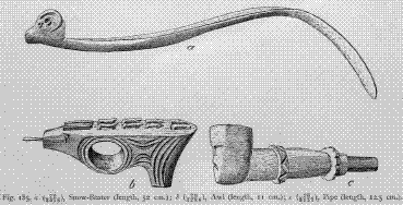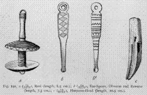 Fig. 191. a, Reel (length, 8.5 cm.); b, Ear-Spoon, Obverse and Reverse (length, 7.3 cm.); c, Harpoon-Head (length, 10.5 cm.).