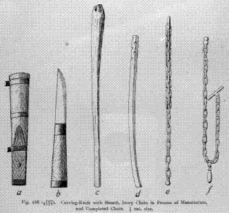 Fig. 190 represents a woman's implement used in the ornamentation of funeral dress. It consists of a common handle made from walrus-tusk, with two flat chisel-edged awls of different widths which turn on pivots. When the smaller awl is required, the larger one is. turned aside,
