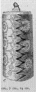 Fig. 192 represents three snuff-boxes of birch-bark, made in Kamenskoye. hose shown in a and c can be closed with separate wooden covers; the handle of the cover in c represents a dog's head. The cover of b opens on a pivot made of tin tubes and wire. The engraved ornamentation is almost the same on all the snuff-boxes. It consists principally of dots, triangles, and concentric circles. The circles are somewhat similar to the circle-orna- ment attached to clothing (see Figs. 224 and 227). The cover on b is ornamented with the representation of a conventionalized plant, the veins being made of inlaid wire, while on c there is a row of double rhombi on the side.
