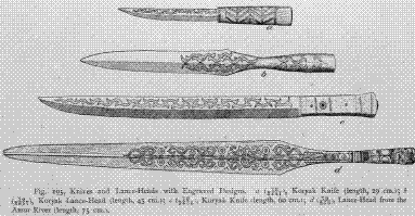 Fig. 195. Knives and Lance-Heads with Engraved Designs. a, Koryak Knife (length, 29 cm.); b, Koryak Lance-Head (length, 45 cm.); c, Koryak Knife (length, 60 cm.); d Lance- Head from the Amur River (length, 75 cm).