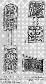 are cut on the unornamented side. The boards] are engraved by the men (the brothers or betrothed of the women to whom the boards belong), for amusement. The engravings consist of household and hunting-scenes; and