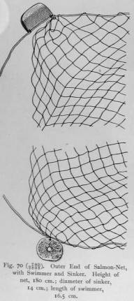 Nets are made of nettle-fibre or sinew-thread. They are of the types of casting- nets, hand-nets, or dip-nets. Casting-nets for dog-salmon and humpback salmon (Fig. 70) are made of nettlethread. They are from twelve to fourteen metres in length; in width, from twenty-nine to thirty meshes, the sides of the meshes measuring from three to five centimetres. Disk-shaped sink-ers are made of whale-vertebrae, and flat floats of drifted larch-wood are used. The thong to which the net is fastened is made of thong of the ringed-seal. The net is pushed into the water by means of a pole from twenty metres or more in length, (Plate xxvii, Fig. 2), made up of several pieces scarfed together, the joints being held by a winding of thong. To push the net out, the end of the pole is placed in a loop in the thong, by