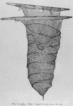 purpose three stakes are driven into the bed of the river, to two of which the front sticks of the net are tied, so that the mouth of the double net is kept wide open, while the point of the net is tied to the third stake. Through the first funnel-shaped bag the fish is carried by the swift current