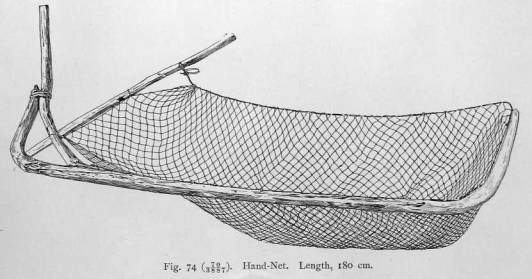 a pole. The fisherman, standing up to his knees in water, drops the net into the river, while holding the free end of the pole with his hands. The Koryak make a hand-net of reindeer-sinew for the purpose of catching tom-cod in small rivers. When it is in use, one fisherman stands in the water and holds the net, while another drives the fish into it. Fig. 75 represents a scoop-net for Salmo socμalis and herring.