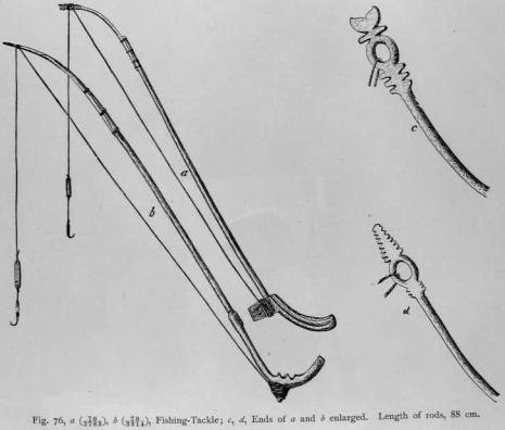 Fig. 76. Fishing- Tackle; c, d, Ends of a and b enlarged. Length of rods, 88 cm.