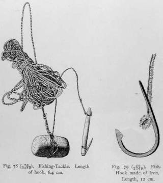 Fig. 78 shows a tackle used for the salveline and grayling. The line is twisted of sinew-thread. Another hook used for flounder, cod, and sculpin, has a stone sinker and a bone barb.