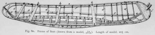 The sides of the boat are formed, in the first place, by the ribs (d). The mid-ribs passing from the curved side-beam (6) are shorter than the ribs which issue immediately from the central timber (a) near the prow. These also form a more obtuse angle with the bottom than do the mid-ribs. The ribs are fastened with thongs to the curved lateral bottom beams (b) of the boat on its inner side, and to the central timber and to the gunwales (e) on the outside. The wooden frame is further strengthened by the rails (f), which run along under the gunwales, and are fastened to the inside of the ribs, and the double longitudinal cleats (g), which are fastened to the ribs both on the inside and on the outside. The outer cleat is of one piece; while the inner one consists of separate pieces, and is not continuous. They serve both to strengthen the frame and as steps to avoid treading on the skin covering while boarding the boat, and to prevent the cargo from pressing against it. Both forward and aft a bow is attached to the rails (f), which rests on the inner side of the frame, against the upturned central timber. Thwarts for the oarsmen (h) rest on the rails (f), and are tied with thongs to the gunwales (e). At the prow and stern semicircular boards also rest on the rails (f). They are tied to the bows of the gunwale. At the stern this board serves as a seat for the steersman, while that at the prow (2) is the seat of the harpooneer. The model represented in Fig. 80 has the following measurements: