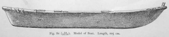 A boat in the village of Kuel that was considered large, which I measured, had a length of nine metres, and a maximum width between the gunwales of two metres and a half. The maximum width was not in the middle, but nearer to the stern. The Koryak boats of Penshina Bay are considerably wider in proportion to their length than the Chukchee1 and Eskimo boats. The boat mentioned by me had thirty ribs on each side, approximately twenty- five centimetres apart. The usual number of thwarts is four or five for eight or ten oarsmen, two oarsmen to each bench. Men as well as women row. The thwarts are mostly situated aft, leaving the forward part free. The freight is placed in the middle of the boat, for which purpose the thwarts are far apart at that place. The prow, where the ribs are fastened to the central timber, is somewhat narrower than the stern part, and the prow is a little higher than the stern. In Kamenskoye the prow projects upward more (see Part I, Plate vii, opp. p. 80) than in the boats on the Paren, where the model was made from which Fig. 80 was drawn.