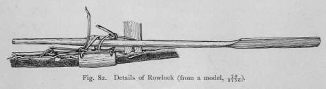 they have an ingenious device, which is also found among the Central Eskimo.1 The oar is placed in two crossing thong loops, which are attached to the rails. To prevent the oar from slipping in the loops, it has two wooden projections with notches, into which the loops are laid. One loop lies in the