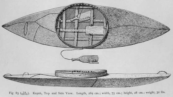 Sitting in the manhole, the hunter can stretch his feet under the deck of the kayak. In the kayak he places the harpoon-heads, the throwing-board, the bag with the harpoon-line, and his arrows. In the hold of the kayak are kept the harpoon-shaft, spears, and gun. When making ready for an attack on sea-animals, the hunter places the harpoon on deck, first thrusting the end of the shaft into a skin loop which is sewed to the deck of the kayak near the prow.