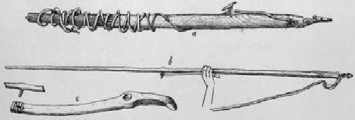 At present the bow is used in hunting only when a rifle is not available, which is seldom the case. In certain families old bows and arrows are preserved with great care, and pass on as heirlooms. The bow is still common in children's games. Boys practise shooting, and have contests in which they use as a target a mitten suspended from a stick driven into the snow. Bow and arrows are burned on the funeral pyres of men; but in the majority of cases the funeral bow and arrows are not genuine weapons, but only imitations. The funeral bow consists of a somewhat bent stave, with a grip in the middle. At the ends a thong is attached, which represents the bowstring. The arrows,1 too, are imitations, with pseudo-feathering at the butt-end.