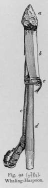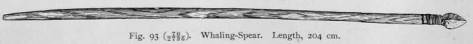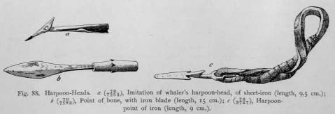 Previous to the introduction of iron, spears were made of bone and stone. The stone spear is still in use, but only for hunting whales (see Fig. 93, p. 552). Traditions are still handed down concerning the bone spears which were used both in war and in hunting. Krasheninnikoff mentions the threepronged spears of the Koryak.1 Presumably the iron spear superseded the old bone spear, at |