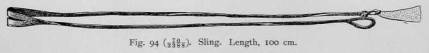 Judging from accounts of the customs of former times, the slung-shot must have been used in war. In consisted of a long thong of thong-seal hide, with a stone at its end. In one tradition which I recorded in Nayakhan, in which a battle between two heroes is described, it is related that the warrior from Nayakhan who was known under the name of "Woman- Snatcher," because he took by violence all the women who pleased him was once surprised by a hostile hero when he had no bow and spear, but only a slung-shot, which he wore like a belt. While dodging his adver- sary's arrows, he hurled his slungshot at the latter with such force that the line encircled his body several times and cut him in twain.