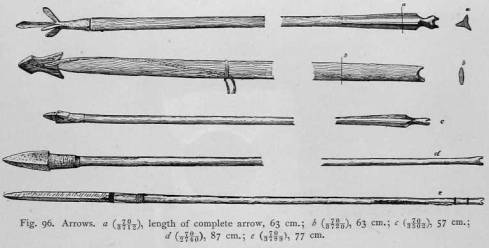 Wooden arrows were made of one piece. Iron arrow-points were either fastened directly to the wooden shaft, or were inserted into a bone foreshaft. I have collected about thirty different types of arrows. The shape of most of them is the same as that of the Chukchee arrows described by Mr. Bogoras 1 Five arrows of somewhat different shape are illustrated here (Fig. 96). That