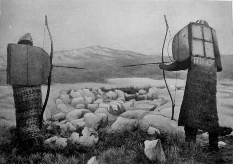 Plate XXIX, Fig. 1, represents two Koryak in armor, with bent bows. The plate is the reproduction of a photograph taken by me, except that the artist, Mr. Rudolf Cronau, sketched in under my direction the missing wing of the armor.