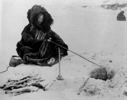 the angler to clear the ice-hole without leaving his position. Fig. 77 b, represents a ladle made of the horn of a mountain-sheep, which is sometimes used instead of a shovel. The catch of tom-cod from under ice is particularly abundant in the mouths of rivers in the beginning of winter. Women, girls, and boys engage in angling. Thickly studded with ice-holes, and muffled figures sitting near them, the river presents an odd appearance. At Itkana, in the fall, men too engage in fishing tom-cod, which is then particularly abundant in Itkana Bay.