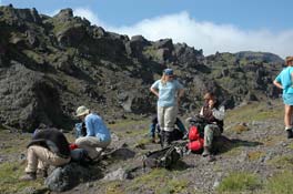 ![]() Фото 1. Вулкан Безымянный в августе 2006 г. На заднем плане – вулкан Камень. Полевые работы на вулкане Безымянном проводились в рамках совместного российско-американского проекта. Геологическая часть исследований здесь была направлена на изучение последствий извержений вулкана 2005 и 2006 гг. и отбор их продуктов. В августе 2006 г. вулкан находился в состоянии умеренной фумарольной активности (фото 1). На экструзивном куполе Новом происходили постоянные сходы лавин. В настоящее время высота купола заметно превысила высоту соммы, а атрио в значительной степени заполнено пирокластикой и обвальными отложениями. В отличие от извержений более ранних этапов активности вулкана, когда формировались хорошо выраженные морфологически пирокластические потоки, часто протягивавшиеся на несколько километров от его подножья, извержения последних лет сформировали обширное поле обвально-пирокластических отложений непосредственно к югу от купола Нового (фото 2), а также серию пирокластических потоков в ущельях на юго-западном и западном склонах старой постройки вулкана. Ранее в этом секторе они отсутствовали. Потоки 2005 и 2006 годов практически неразличимы морфологически и литологически. Доля резургентных глыб в них среди ювенильной пирокластики весьма значительна. Они представлены обломками экструзивных и эффузивных образований прошлых лет, различной окраски и плотности. Несомненно ювенильное происхождение имели крупные глыбы, развалившиеся в месте отложения на блоки из-за внутренних напряжений, возникших при охлаждении (фото 3). Эти глыбы имеют характерную неравномерную окраску: светло-серую с поверхности, переходящую в черную во внутренних частях. Изменение цвета вызвано окислением и кристаллизацией медленно остывающих горячих внутренних частей глыб. Для надежного отбора ювенильных образцов последнего извержения выбирались подобные глыбы в верхних частях потоков ближе к куполу. |