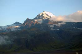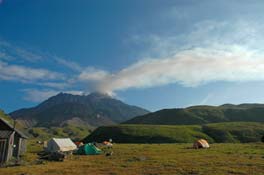 Лагерь экспедиции. На заднем плане купол Лохматый и вулкан Безымянный |