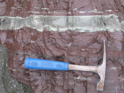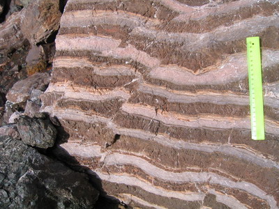 ![]() Рис.5. Пепловые прослои в кремнистых породах в береговых обрывах на мысе Налычево |