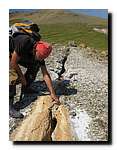 На третьем участке (р. Белая) планировалось изучение гипербазитового массива г. Солдатской и зон серпентинитового меланжа в его обрамлении. Решаемые задачи: опробование реститогенных и кумулятивных перидотитов, изучение метаморфических включений в серпентинитовом меланже; поиск и опробование разностей ультрабазитов с сульфидной медно-никелевой минерализацией; поиск и опробование жильных и метасоматических пород с сульфидной минерализацией, как возможных источников золота в россыпи к северу от гипербазитового массива.