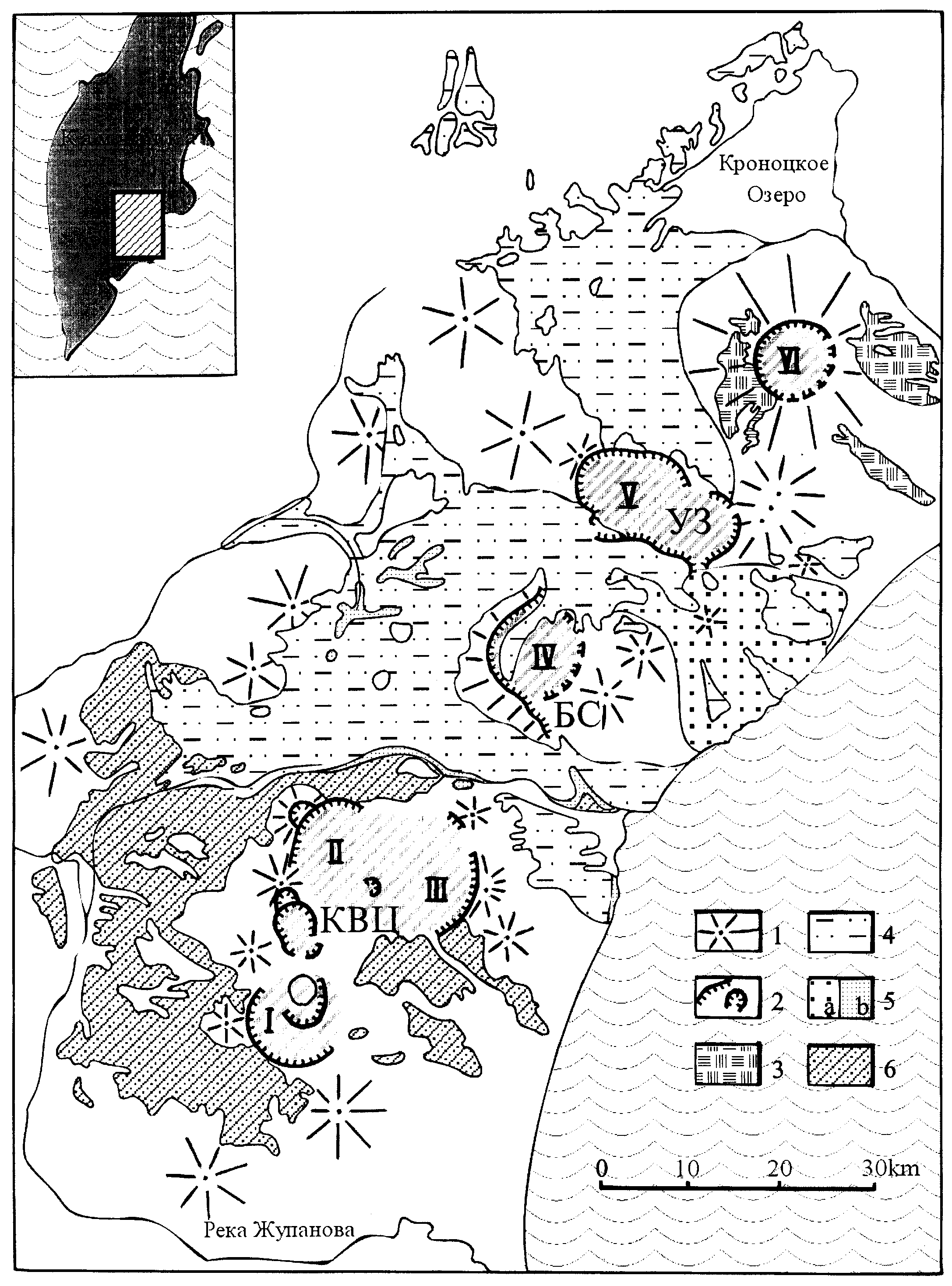 I – Крайняя, II – Соболиного, III – Стены, IV – вулкана Большой Семячик, V – Узон-Гейзерная, VI –Крашенинникова); 3 – пемзовые туфы, связанные с формированием кальдеры Крашенинникова; 4 – игнимбриты, связанные с Узон-Гейзерной депрессией; 5 – игнимбриты (а) и пемзовые туфы (б), связанные с кальдерой Большой Семячик; 6 – игнимбриты, связанные с кальдерами Стены, Соболиного и Крайней. Буквами обозначены вулканические центры: КВЦ – Карымский; БС – Большесемячикский; УЗ – Узонский.Рис.11”