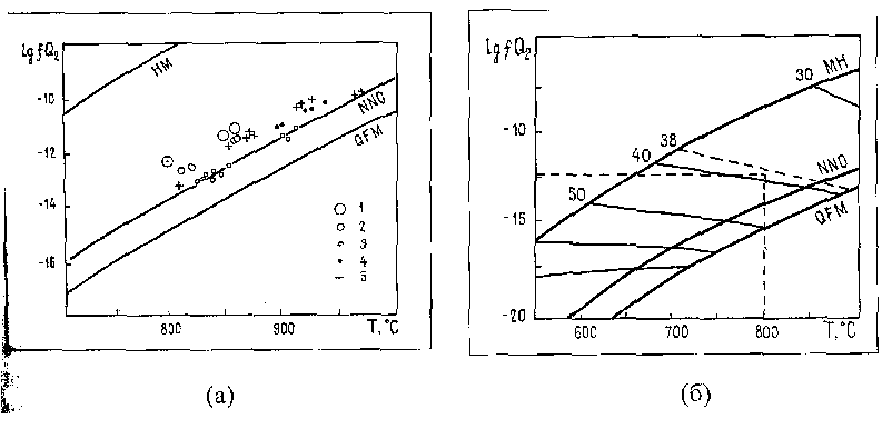 Температура магматических расплавов оценивалась с помощью магнетит-ильменитового геотермометра (54). Согласно времени выделения рудных минералов, эти температуры наиболее реально отражают температурный режим в предэруптивной магматической камере. Mt - Ilm геотермометр позволяет определять и фугитивность кислорода.