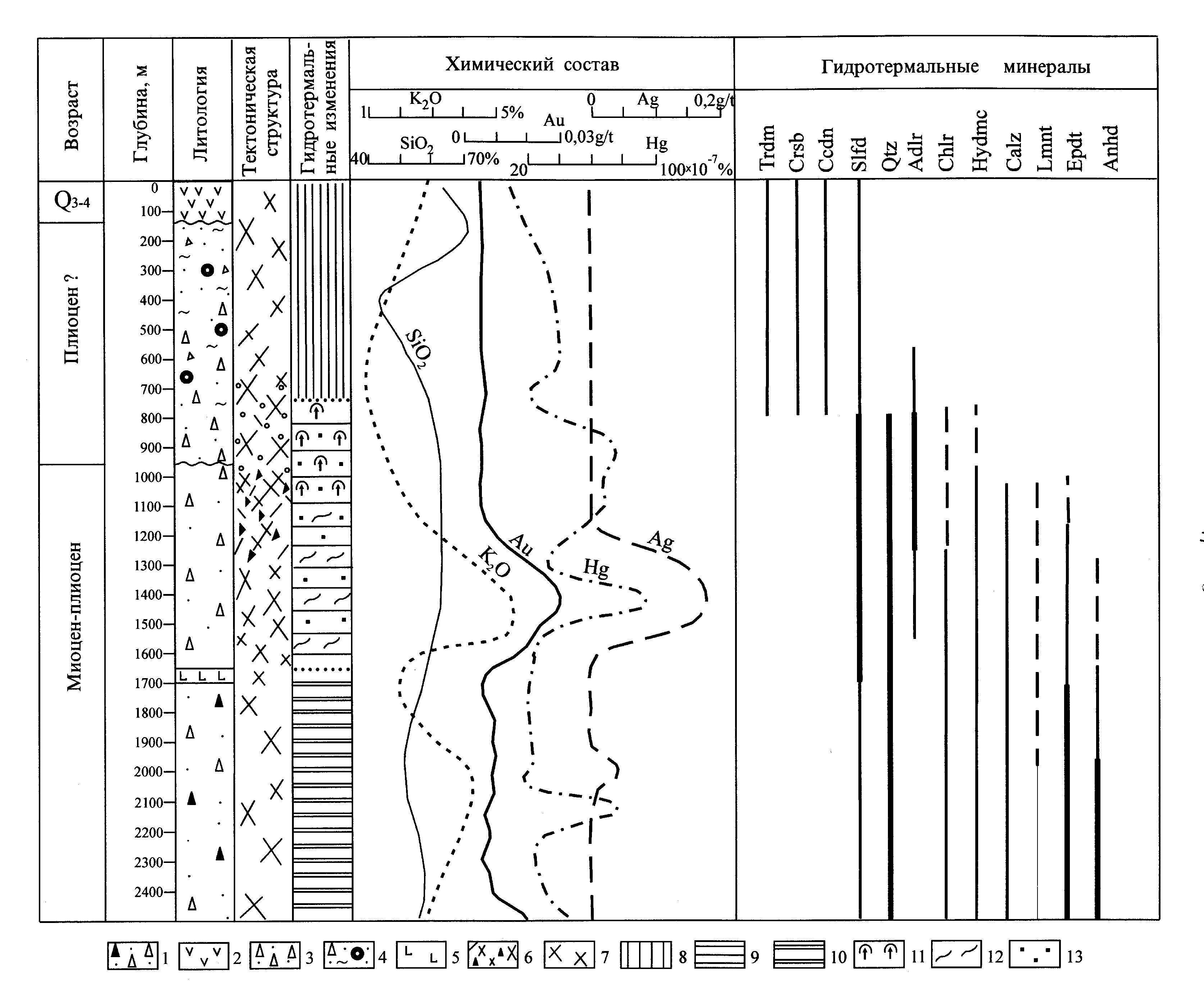 1 – туф литокристаллокластический интрузивный андезито-базальтового состава; 2 –лавы андезитов; 3 – туф литокристаллокластический пестроцветный андезитового состава, псефо-псаммитовой размерности обломков; 4 – туффит с включениями реликтового органического материала; 5 – лавы (дайки, силлы?) андезито-базальтов; 6 – тектоническая брекчия; 7 – умеренно трещиноватые породы; 8 – низкотемпературная опал-кристобалит-тридимит-халцедоновая минерализация; 9– низко-среднетемпературные существенно кварц-адуляр-гидрослюдистые метасоматиты с включениями рудных минералов; 10 – среднетемпературные пропилиты кварц-хлорит-эпидот-мусковитового состава; 11 – зоны перехода жидкость-пар (кварц-адуляровые метасоматиты); 12 – кварц-халцедоновые прожилки с рудными минералами; 13 – рудная минерализация; гидротермальные минералы: