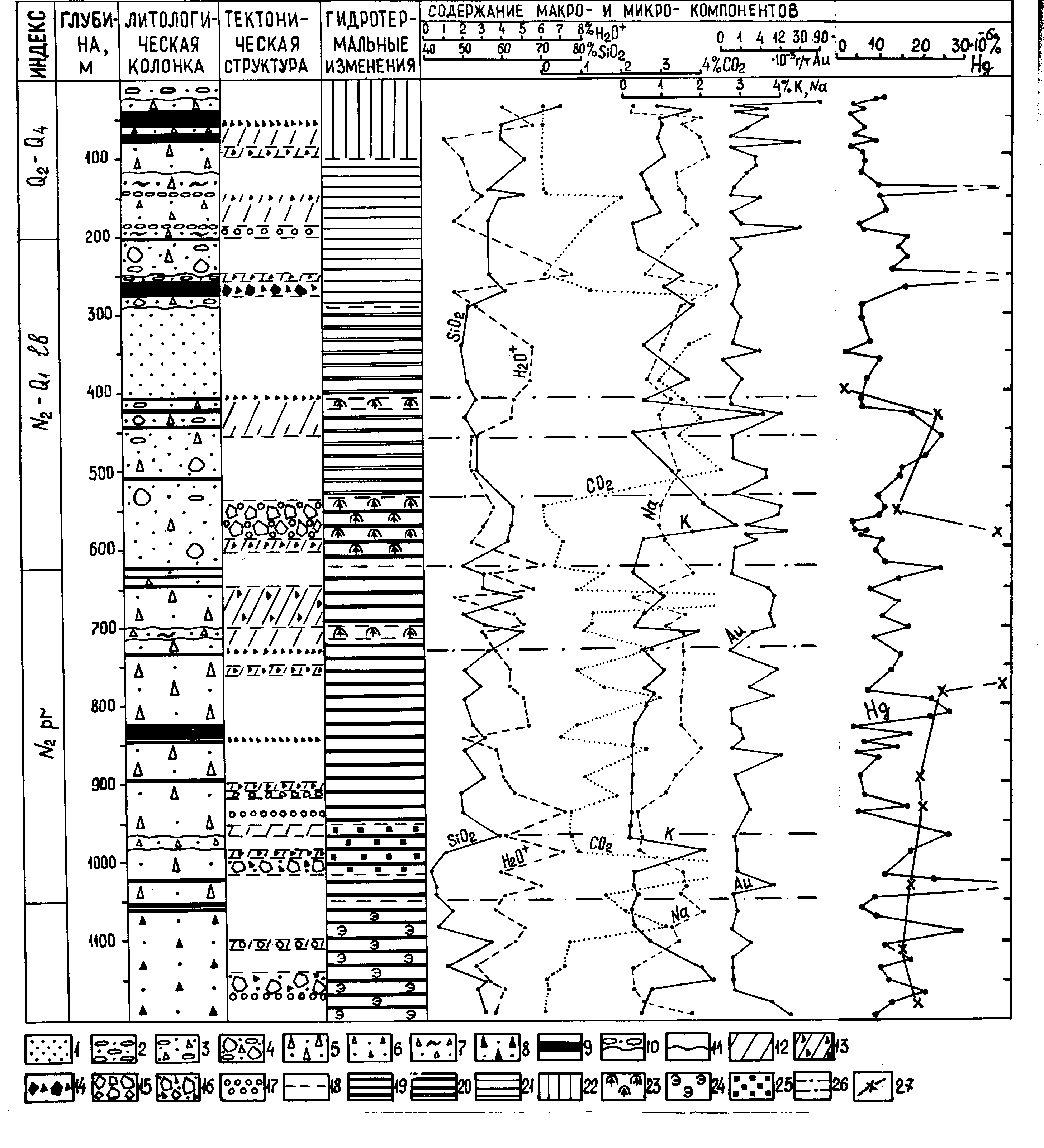 1 - алевролиты, песчаники и туфоалевролиты, туфопесчаники; 2 – галечники; 3 –туфогалечники; 4 – туфоконгломераты; 5 – туфы псефитовые андезитового состава; 6 – то же, псаммитовые; 7 – игнимбриты и пемзовые туфы от андезитового до дацитового состава; 8 – интрузивные туфы; 9 – эффузивы, дайки и силлы андезито-базальтового состава; 10 – грубообломочные делювиальные отложения; 11 – стратиграфические границы; 12 – зоны трещиноватости; 13 – тектонические брекчии; 14 – брекчии эндо- и экзоконтактов лавовых потоков, даек и силлов; 15 – гидротермальные брекчии; 16 – полимиктовые комбинированные брекчии; 17 – участки повышенной пористости пород; 18 – границы тектонических зон и фаций метасоматитов; 19 – среднетемпературные пропилиты; 20 – низко-среднетемпературные пропилиты; 21 – низкотемпературные пропилиты; 22 – опал-каолинит-алунитовые породы зоны сернокислотного выщелачивания; 23 – гидротермалиты зоны перехода жидкость-пар; 24 – повышенное содержание эпидота в породах; 25 – то же, сульфидов; 26 – границы геохимических аномалий; 27 – распределение содержаний ртути в пиритах.