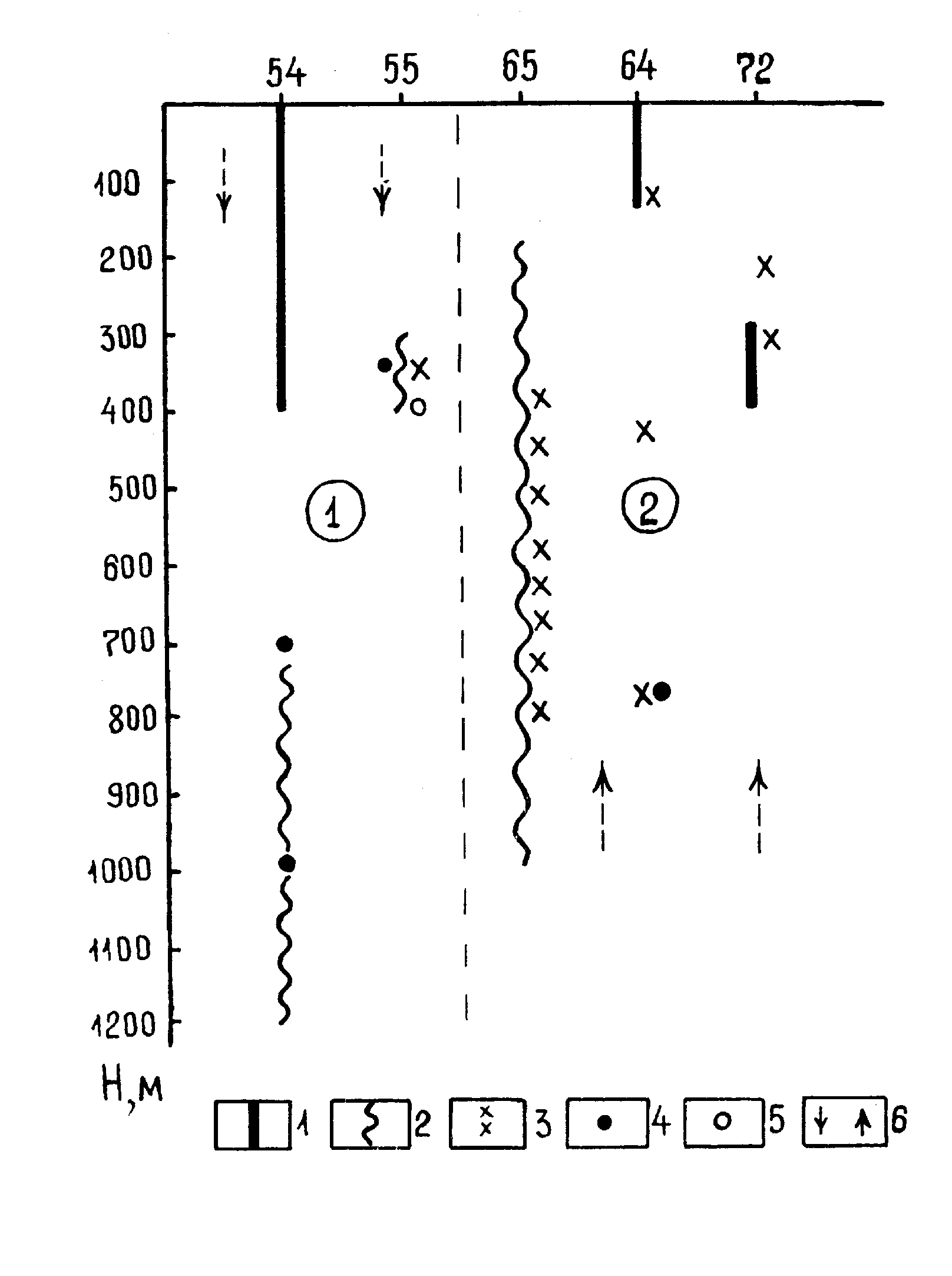 1-5 – распределение микрокомпонентов в пирите: Au, 2 – Pb, 3 – As, 4 – Cu, 5 – Zn; 6 – преобладающее направление движения вод. “Рис. 34”