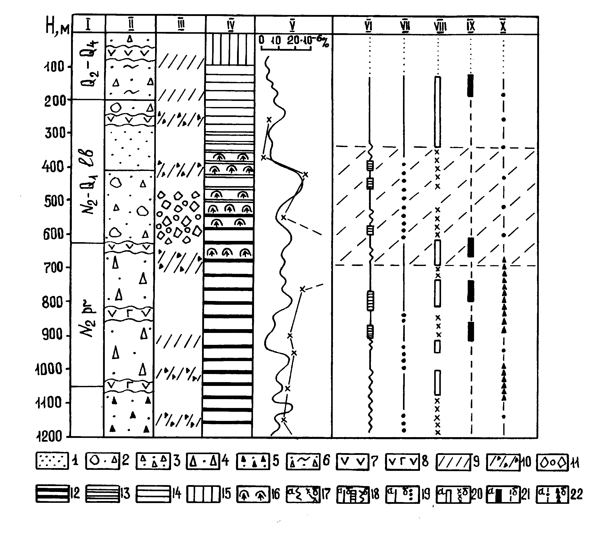 I – возраст отложений (pr – парусная свита, lb – лебединская), II – литология, III – тектоническая структура, IV – гидротермальные изменения, V – распределение ртути по разрезу, VI – X - морфологические характеристики и цвет пирита. 1 – Туфоалевролиты и туфопесчаники; 2 - туфоконгломераты; 3 – туфы псаммитовые; 4 – туфы псефитовые; 5 – туфы интрузивные; 6 – игнимбриты; 7, 8 – андезиты и андезито-базальты, соответственно; 9 – зоны трещиноватости; 10,11 – тектонические и гидротермальные брекчии, соответственно; 12-14 – пропилиты высоко-, средне- и низкотемпературные, соответственно; 15 – метасоматиты зоны кислотного выщелачивания; 16 – зона перехода жидкость-пар; 17 – распределение ртути: а – во вмещающих породах, б – в пирите; 18 – преобладающая форма зерен пирита: а – агрегатная, б – кристаллическая, в – смешанная; 19 – размер зерен: а – 0,1-1,0 мм, б – 0,1-1,6 мм; 20 – преобладающий габитус: а – кубический, б – пентагондодэкаэдрический; 21 – преобладающая форма агрегатов: а – массивно-зернистые, б – сростки кристаллов; 22 – цвет: а – ярко-желтый, б – желтый с побежалостью. Заштрихован участок разреза, отличающийся характером распределения морфометрических параметров пирита.