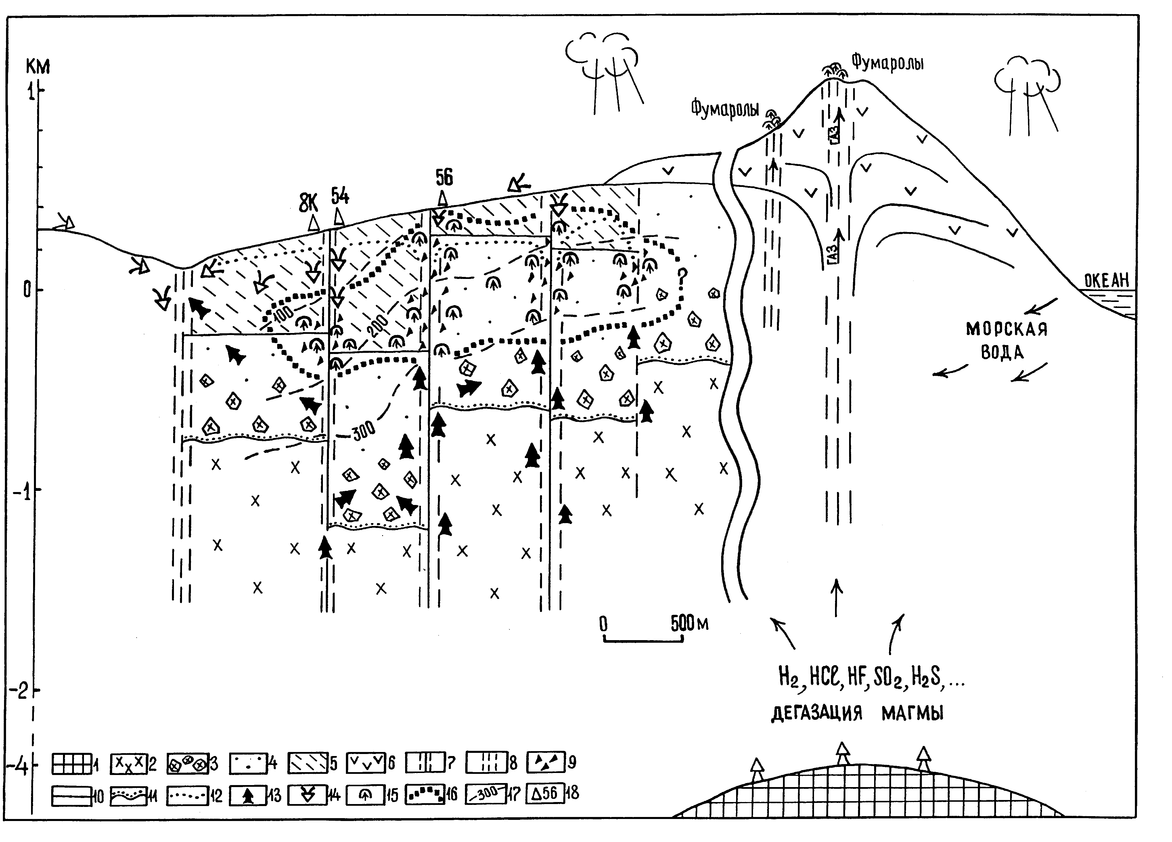 1 верхняя кромка периферического магматического очага; 2 субинтрузивные диориты габбро-диориты; 3 интрузивные туфы (брекчии); 4 отложения парусной свиты; 5 отложения лебединской свиты; 6 четвертичные лавы андезитов; 7 тектонические нарушения, установленные; 8 то же, предполагаемые; 9 гидротермальные брекчии; 10 литологические границы; 11- интрузивные границы; 12 нижняя граница распространения аргиллизитов зоны кислотного выщелачивания; 13 восходящий поток глубинных субщелочных хлоридно-натриевых гидротермальных растворов; 14 нисходящий поток метеорных вод и кислых сульфатных гидротермальных растворов; 15 пародоминирующие зоны; 16 область смешения хлоридно-натриевых и сульфатных терм, интенсивного кипения растворов и формирования рудной минерализации; 17 изотермы по данным каротажа скважин; 18 разведочные скважины и их номера.