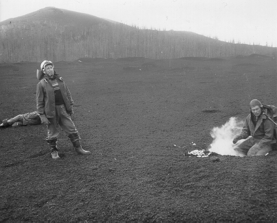 Доктор геолого-минералогический наук Е.К.Мархинин наблюдает за извержением Южного конуса БТТИ, а молодой вулканолог А.А.Овсянников греется на вулканической бомбе,которая врезалась в снег, покрытый свежим пеплом. Май 1976 г.