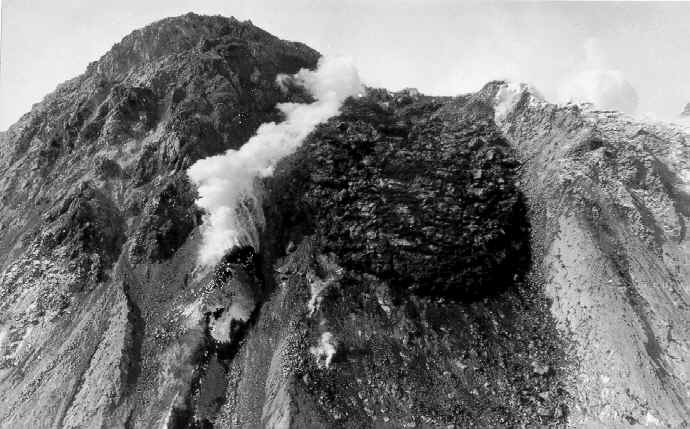 На этом снимке запечатлён уникальный момент в ходе извержений вулкана Безымянный. Впервые в истории современных извержений лавовый поток покинул вершину экструзивного купола Новый и стал спускаться по его склону. Март 1977 г.