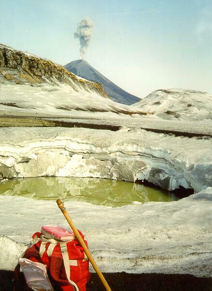 One of the eruption funnels at the cone formed in the Lake Karymskoe during the eruption in January 1996.