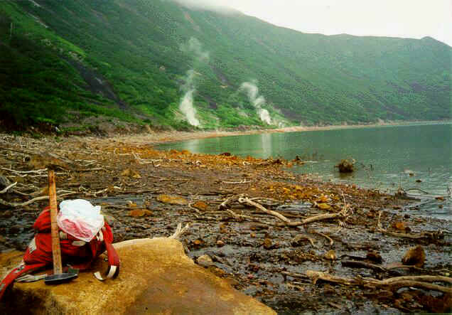 The eruption in the Lake Karymskoe caused formation of tsunami waves which completely destroyed the near-shore area and all vegetation. There can be well seen steaming over the Akademii Nauk hot springs.