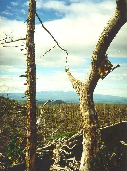 На огромной территории лес погиб уже в результате Большого трещинного Толбачинского извержения. Деревья погибли как от механического воздействия тефры, так и от легкорастворимых едких химических веществ. 1999 год.