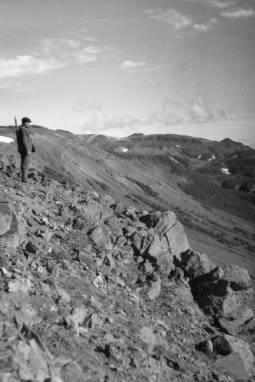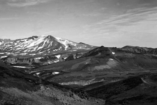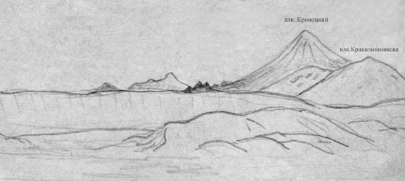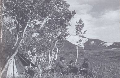 Пологой долинкой, идущей от Центрального озера по направлению к Семячику, ехали мы на дол. Как полого и хорошо здесь ехать, как по дороге. Вечером в начале одной из падей остановились на ночлег. Я взял треногу и теодолит и поднялся на дол. Стал засекаться – нужно определить свой путь подетальней. Хорошо был виден Бараний пик и почти вся кальдера, Тауншиц, Кроноцкая, Крашенниникова, Кихпиныч и Семячик. Я торопился и нервничал, так как с моря волнами набегали облака и начинали быстро закрывать вершины сопок. Кроме того, становилось темно и холодно.