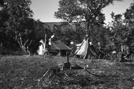 Только исчезла та зелень березняка, что была здесь в прошлый раз летом. Холодом и грустью веяло от голых берез. Лагерь поставили на том же месте, где была у нас палатка два года назад. Хвоща здесь достаточно.