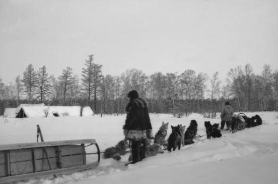 Сегодня из-за пурги народ колебался, но все же выехал. Нас едет 5 нарт до Уки. Из них 2 почтовых каюра с оригинальными фамилиями Усиков и Пузиков. Вокруг нас ландшафт, состоящий из очень пологих увалов и понижений, покрытых тундрой и редким березняком. Местность, и в придачу к ней пелена снегопада, не оставляют в памяти ничего запоминающегося. Дорога некаткая, собаки с трудом тянут нарту. Отвернувшись от ветра, сижу спиной вперед, иногда засыпаю.