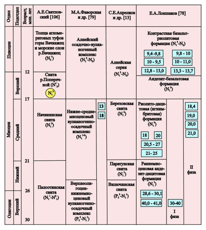 Рис. 10. Сопоставление разрезов палеоген-неогеновых отложений Мутновского геотермального района в представлениях различных авторов. Условные обозначения см. на рис.2. |