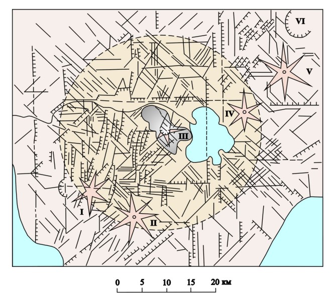 Предыдущими исследованиями было установлено, что основной структурой в районе является пологий аккумулятивно-тектонический свод размером 35x55 км /54/. Предполагалось, что ведущим процессом в образовании свода являлась вулканическая аккумуляция, а роль тектоники была невелика /64/. Приведенные выше данные, в которых особое внимание было уделено анализу особенностей структуры на отдельных детально изученных нами участках, подтверждают представления о существовании в районе пологого свода. Однако основной причиной его образования явилось, с нашей точки зрения, тектоническое поднятие. Выше было показано, что амплитуды поднятия на участках составили 1000, 600-700, 400-500 и почти 400 м и на поверхность были выведены наиболее древние в районе породы нижне-среднемиоценового возраста. На рис. 3 нанесены все известные в районе выходы этих пород. По ним отчетливо отбиваются основные структуры южной оконечности Камчатки: Южно-Камчатский антиклинорий на юго-востоке и Паужетский свод в центре. Область сопряжения этих структур проходит восточнее Курильского озера. Свод имеет диаметр около 40 км. Максимальная амплитуда поднятия в центре достигала, по-видимому, около 2 км. Как следует из вышеприведенных данных, в сводовое поднятие вовлечены в основном породы миоценового возраста вплоть до верхнемиоценовых песчаников. Поднятием затронута также толща базальтов на Голыгинских горах (участок Северный). Возраст этой толщи предположительно нижнеплиоценовый. В то же время плиоцен-нижнечетвертичные вулканы (горы Шумная, Ключевская, Ушастый Камень и др.) значительно меньше подняты, либо совсем не подняты. На основании этого можно сделать вывод, что образование свода произошло в основном в конце миоцена - начале плиоцена, т.е. 10-15 млн. лет назад. Этот вывод согласуется с представлениями О.Н.Егорова /55/ о том, что в указанный период происходит общее воздымание района. В самом конце позднего плиоцена и начале раннечетвертичного времени в центре свода образовалась Паужетская вулкано-тектоническая депрессия, которую, как показано в последние годы /64, 77/, следует рассматривать как компенсационную просадку, образовавшуюся в результате выноса из недр Земли больших масс вулканического материала в течение плиоцен-нижнечетвертичного времени. Структура просадки в настоящее время изучена слабо. Имеющиеся данные о залегании отложений на площади Паужетского месторождения /76/ свидетельствуют о погружении пород с юга на север. При анализе условий залегания пород на участке Центральном также установлено общее погружение пород в северо-западном направлении. По-видимому, наибольшее погружение в пределах депрессии (на 1000-1200 м) испытала ее северо-западная часть. Следующим важным этапом в развитии Паужетского геотермального района явилось извержение больших масс туфов и образование игнимбритов среднечетвертичного возраста. Объем их оценивается в 70-80 км3 /63/. Центры извержения туфов и игнимбритообразующего материала располагаются за пределами Паужетской депрессии (рис. 3). Эти пирокластические продукты снивелировали рельеф, заполнив пространство между постройками плиоцен-нижнечетвертичных вулканов. В дальнейшем структура района усложнялась в основном в его центральной, погруженной части (см. описание участка Центрального) и в районе Кошелевского вулкана /108/. В гол