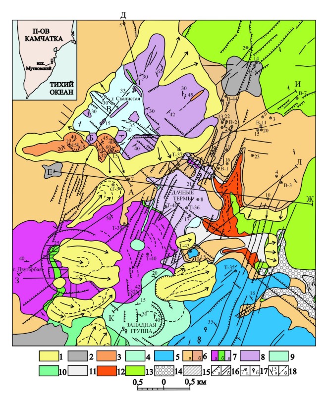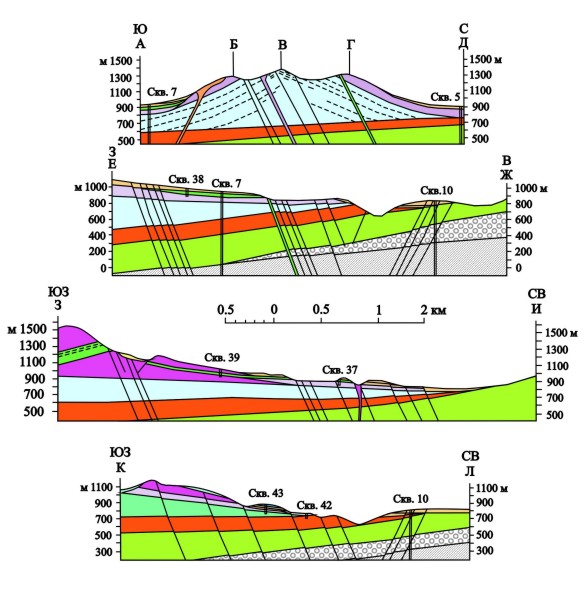 Рис.13. Геологические разрезы района Мутновского месторождения гидротерм. Условные обозначения смотри на рис.12
